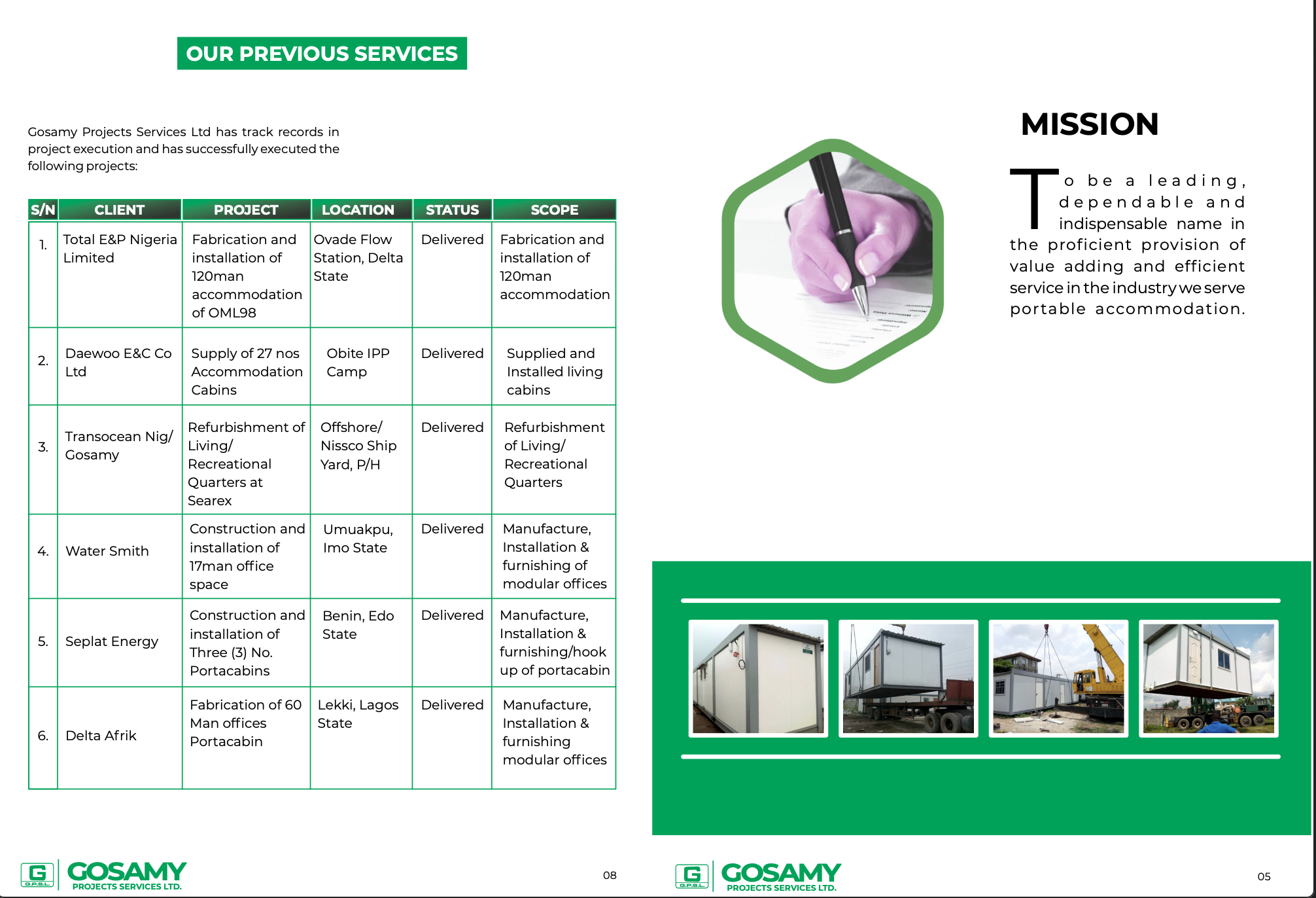 We are involved in the oil and gas servicing business. Throughout the past years, our commitment to service, client’s high standards of quality, safety and cost, effective services have been our motivation force. It is on record that Gosamy has not had any failures in project execution, no matter the odds and this could be attested to by any of our major clients. To maintain this standard and remain responsive to development in the industry, we have developed a systematic approach to project execution. Incorporated with this approach is a feedback mechanism loop that provides data for regular upgrade of our work procedures.